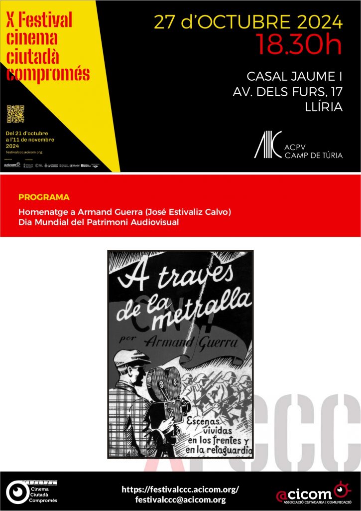 27/10/2024 19:30h. Dia Mundial del Patrimoni Audiovisual: ARMAND GUERRA. Casal Jaume I de Llíria, FCCC2024 organitza amb IDECO Camp de Túria